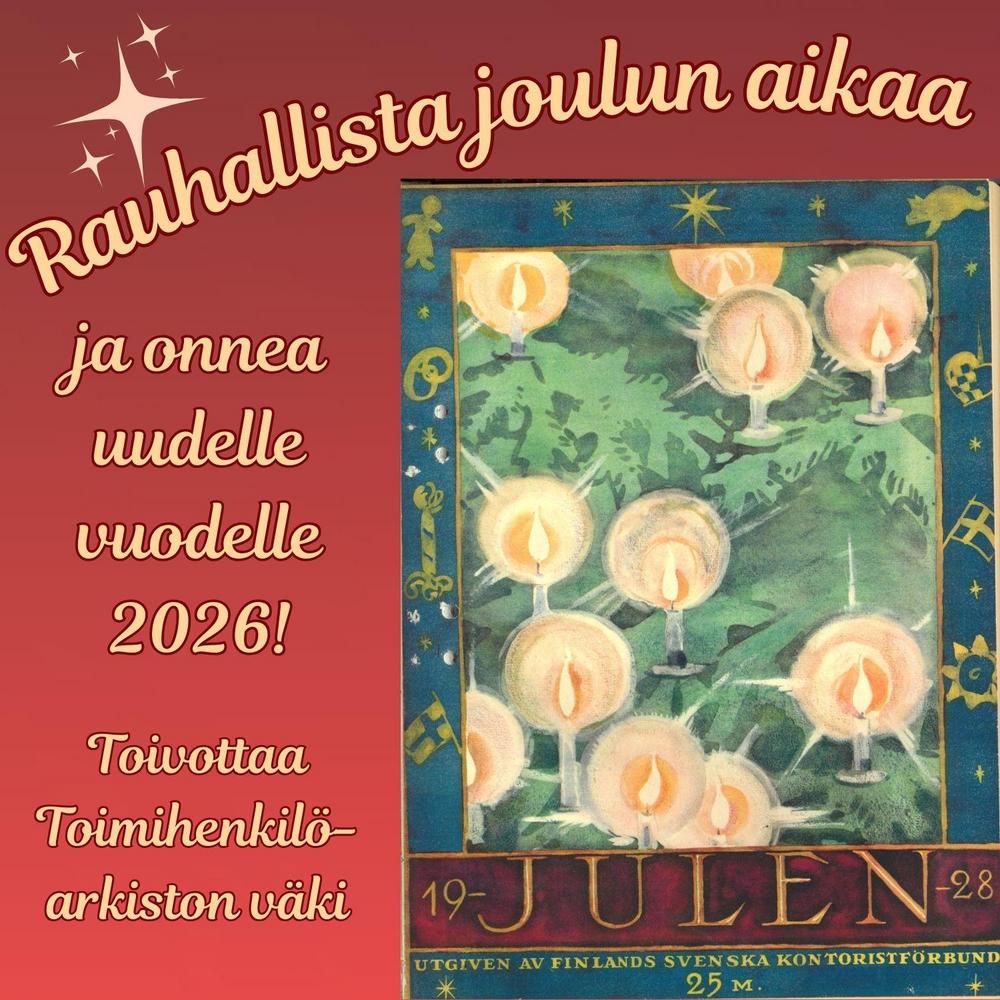 Rauhallista joulun aikaa ja onnea uudelle vuodelle 2026, toivottaa Toimihenkilöarkiston väki. Finlands Svenska Kontoristförbundin vuoden 1928 Julen-lehden kannessa loistavat joulukuusen kynttilät.…