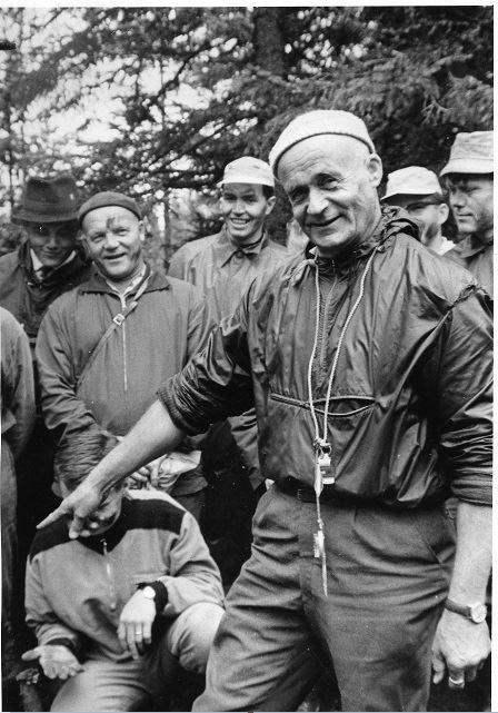 Lähes 200 opettajaa eri puolilta Kainuuta oli elokuun 1965 lopussa Vuokatilla laskennon, äidinkielen ja kuvaamataidon kursseilla. Eräänä osana kurssia oli Vuokatin vaellus. 50 opettajaa seurasi Vuokatin Vaeltajaa, opettaja Antti Kukkosta, joka oli parinkymmenen vuoden ajan samoillut Vuokatin rinteillä. Tällä kertaa samotun reitin pituus oli 20 km. Luonnonkauniin Möykkylammin rannalla annettiin ensikertalaisille "susikaste". Se on juhlallinen toimitus, jossa kasvoihin vedettiin nuotiohiiltä ja annettiin sudelle nimi. Monen vaeltajan jäseniä painoi matkan varrella väsymys, mutta "emäsuden" Antti Kukkosen keittämä kahvi virkisti niin, että kaikki jaksoivat reitin loppuun. Vuokatin urheiluopiston saunan lauteilla kylvettiin väsymys jäsenistä ja päätettiin vakaasti uusia toisen kerran sama lenkki. - Kuvassa "emäsusi" Antti Kukkonen hymyilee mehevästi tehtyään monta uutta sutta.