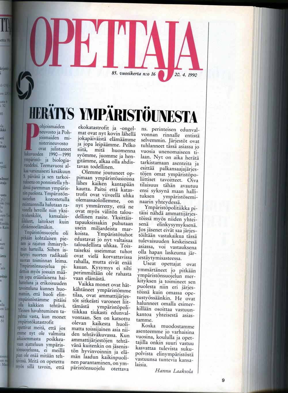 ”Kun ammattijärjestön tehtävänä kuitenkin on jäsenistön hyvinvoinnin ja elämän laadun kaikinpuolinen parantaminen, on ympäristönsuojelu otettava ns. perinteisen edunvalvonnan rinnalle entistä selvemmin. Järjestöt ovat tuhlanneet tässä asiassa jo vuosia unenomaiseen tilaan. --- Useat opettajat ovat ymmärtäneet jo vuosia ympäristönsuojelun merkityksen ja toimineet sen puolesta niin eri järjestöissä kuin omassa opetustyössäänkin. He ovat halunneet omalla esimerkillään osoittaa vastuunkantoa yhteisestä asiastamme. Koska muodostamme asenteemme jo varhaisina vuosina, koululla ja opettajilla onkin suuri vastuu kasvattaa tulevista sukupolvista elinympäristöstä vastuunsa tuntevia kansalaisia”.