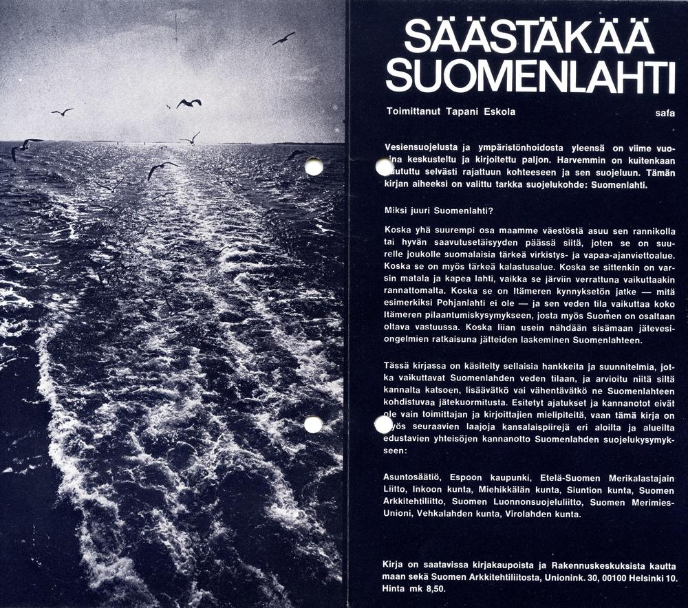 Suomen arkkitehtiliitto SAFA nosti 1970-luvun alussa esiin Suomenlahden ympäristöongelmia. Liitto julkaisi yhdessä mm. Suomen Luonnonsuojeluliiton, Suomen Merimies-Unionin, Etelä-Suomen Merikalastajain Liiton ja useiden Suomenlahteen rajoittuvien kuntien kanssa kirjan Säästäkää Suomenlahti vuonna 1972. Kirjan toimitti arkkitehti ja Arkkitehti-lehden silloinen päätoimittaja Tapani Eskola ja se sisälsi vesiensuojelua koskevaa asiatietoa. Kirjan kustansi Suomen Arkkitehtiliitto. Kirjan julkaisemisen lisäksi hankkeen työryhmä otti kantaa ja tarjosi ratkaisuja ajankohtaisiin ongelmiin, kuten jätevesien laskemiseen puhdistamattomana itäiseen Suomenlahteen.