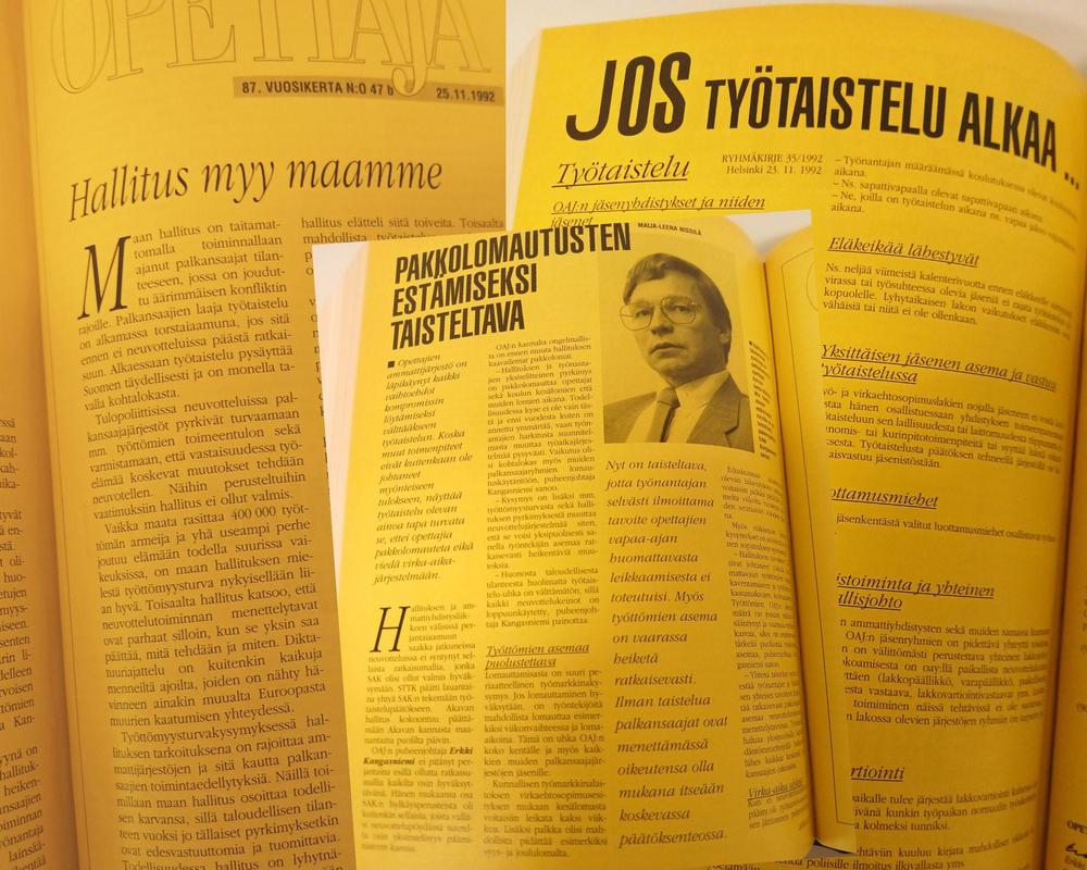 ”Aikamoisessa saunassa oltiin. Vuoden 1984 opettajalakko oli lasten leikkiä näihin neuvotteluihin verrattuna”. Opettaja 49-50/1992, Yhtenäinen valtuusto hurrasi tupolle.